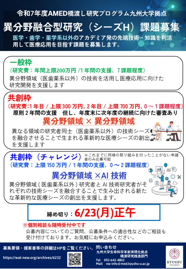 九州大学では、令和7年度のシーズH(異分野融合型研究開発課題)を学内外より広く募集いたします。