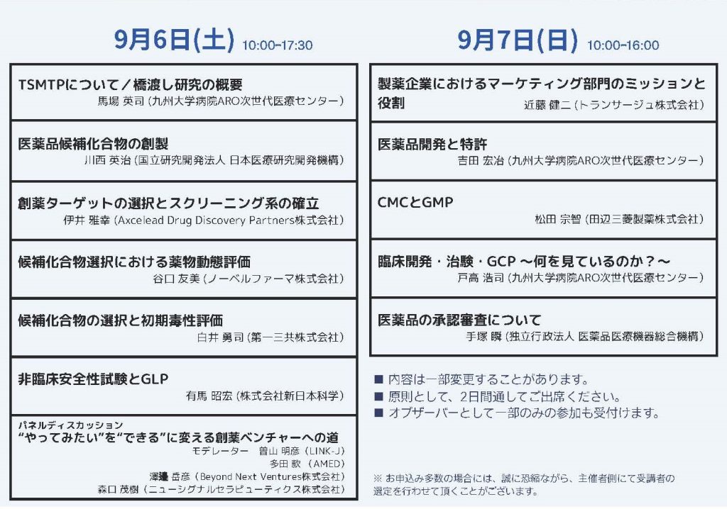 九州大学病院ARO次世代医療センター・九州大学生命科学革新実現化拠点橋渡研究推進部門では、今年も創薬に特化した教育プログラム、TSMTP(Translational Science & Medicine Training Program) 2025を今年度も開催する運びとなりました。