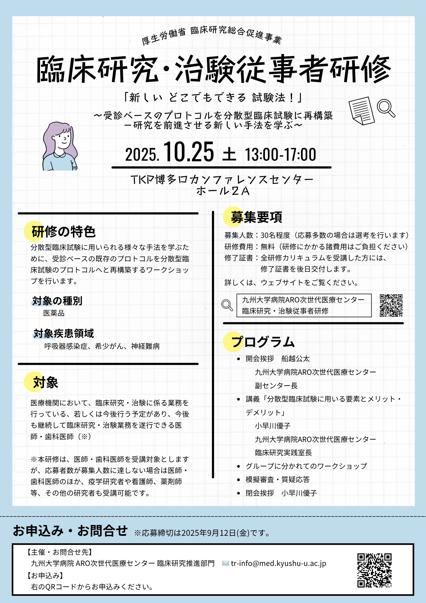 ※本研修は、医師・歯科医師を受講対象としますが、応募者数が募集人数に達しない場合は医師・歯科医師のほか、疫学研究者や看護師、薬剤師等、その他の研究者も受講可能です。