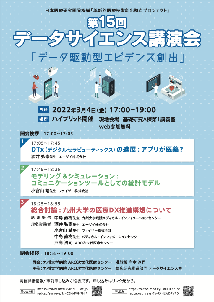 九州大学病院ARO次世代医療センターARO臨床研究推進部門データサイエンス室主催によりデータサイエンス講演会を開催いたします。