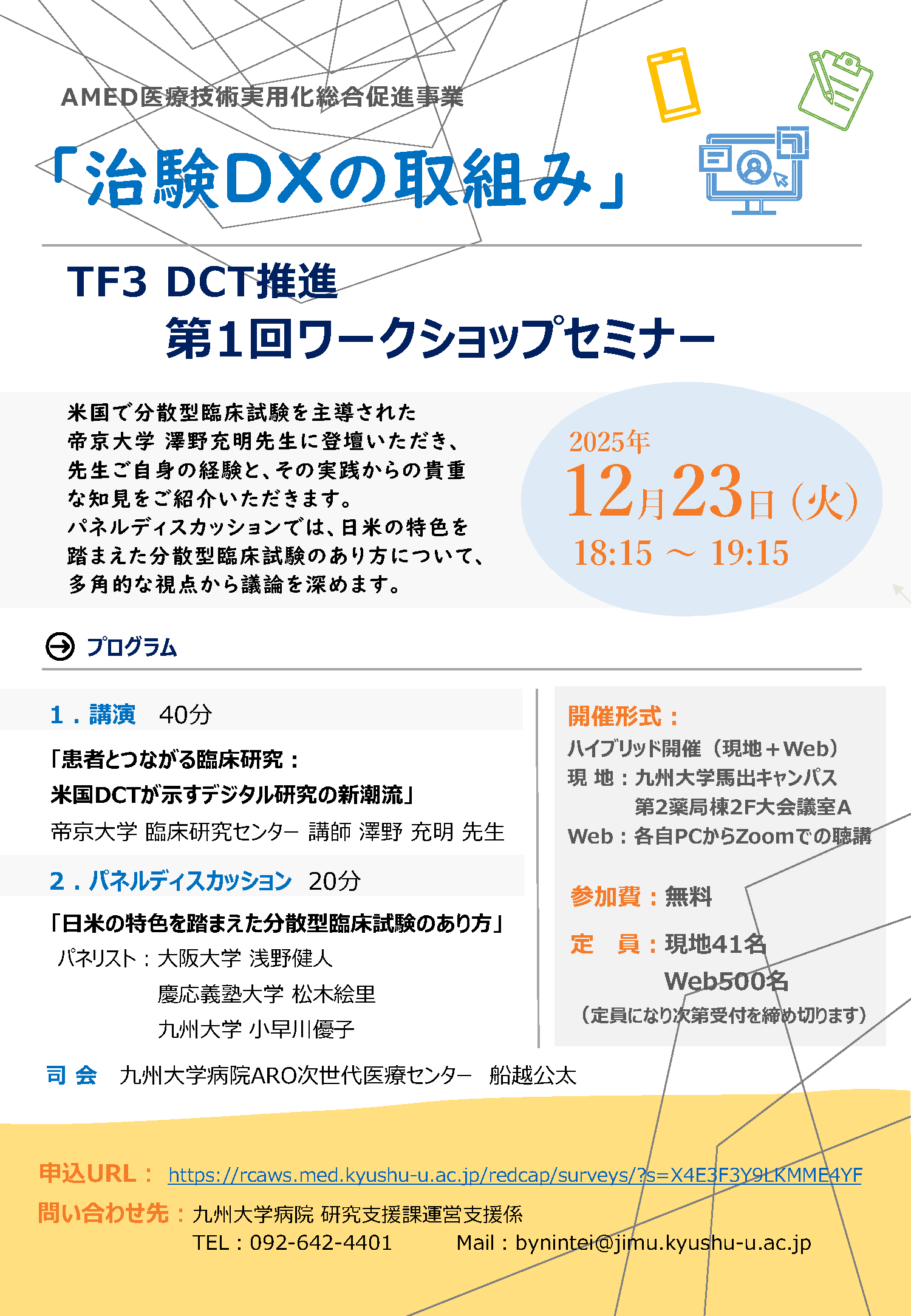九州大学病院ARO次世代医療センターは、全国の臨床研究中核病院が取り組むAMED医療技術実用化総合促進事業「治験DXの取組み」の主機関として、様々な取り組みを行っています。この度、米国でlong COVIDに対するプラセボ対照無作為化二重盲検試験を分散型臨床試験として実施した帝京大学の澤野充明先生を講師にお迎えし、下記セミナーを開催いたします。分散型臨床試験は、デジタル技術などを活用しながら、従来は試験実施医療機関で行われていた臨床試験に関する行為を医療機関外に分散化させる手法で、「患者中心の設計」で治験を効率化させる注目の手法です。ぜひこの機会に、新しい臨床試験の手法について理解を深め、今後の臨床研究に活かしていただければ幸いです。